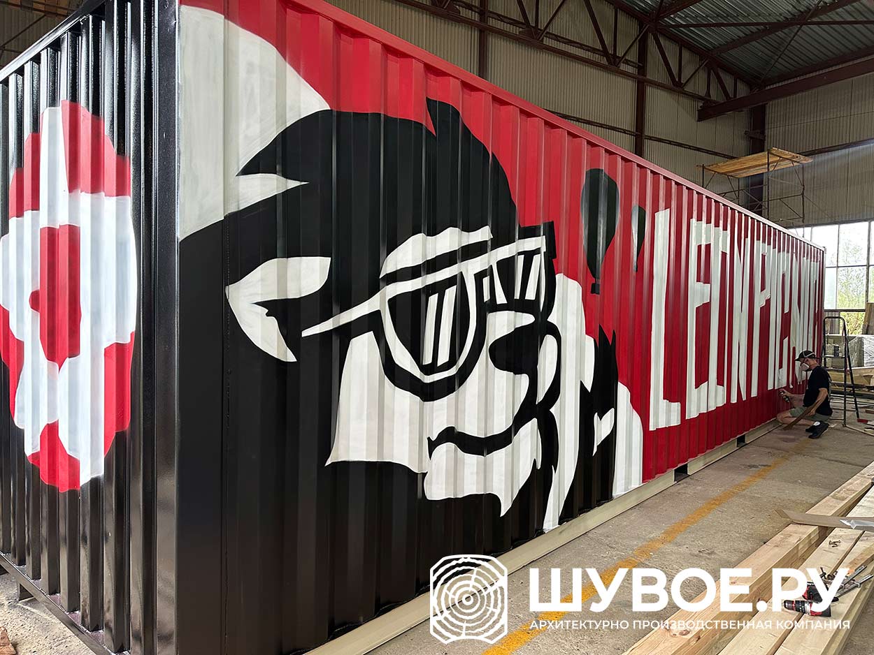 Из морского 40 футового контейнера - прочный и надежный, можно спокойно возить на мероприятия. В закрытом состоянии вандалоустойчивый.
